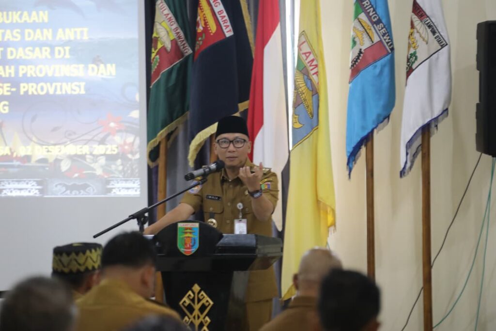 JBK, Lampung Selatan— Gubernur Rahmat Mirzani Djausal membuka Pelatihan Integritas dan Anti Korupsi Tingkat Dasar di lingkungan Pemerintah Provinsi Lampung dan Kabupaten/Kota se-Provinsi Lampung di Aula BPSDM Provinsi Lampung, Selasa (2/12/2025).